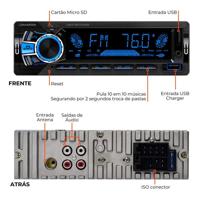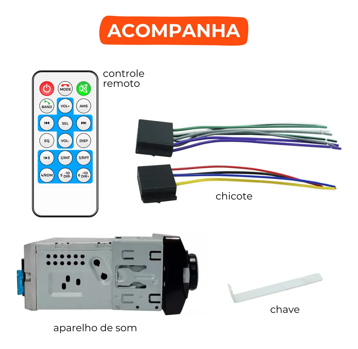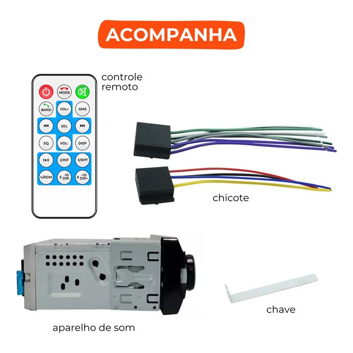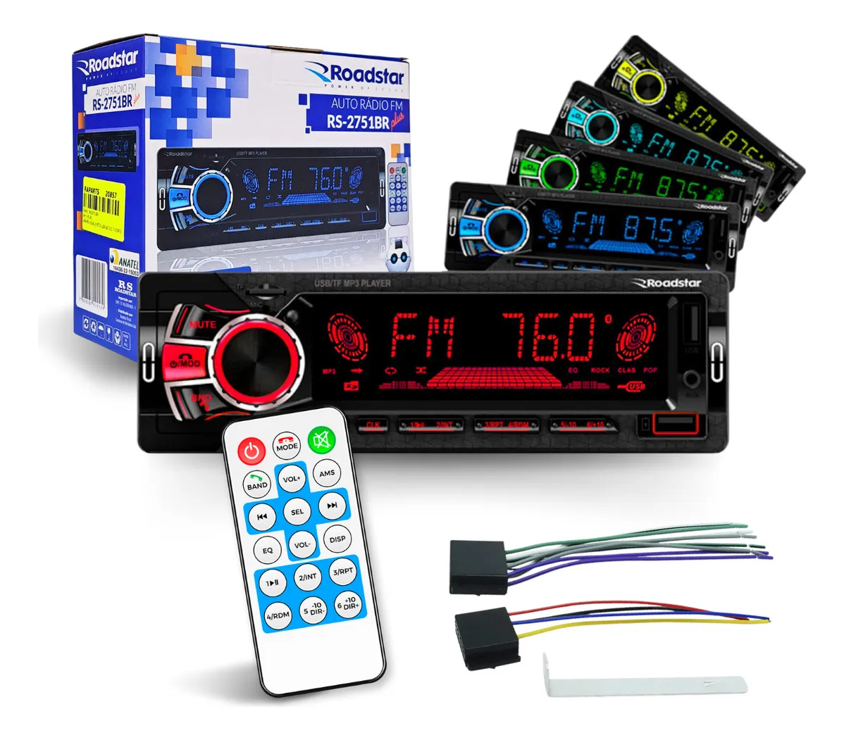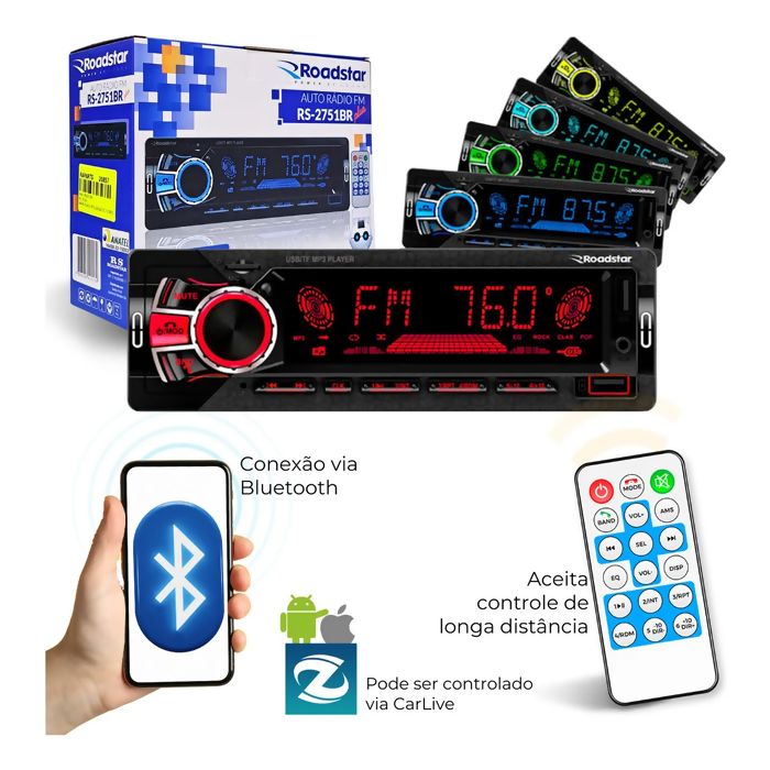 O som automotivo da Roadstar vai ser o seu melhor companheiro para aumentar o volume e desfrutar do caminho. Sempre pronto para você mergulhar na música que mais gosta e com o melhor som. Os seus passeios de carro serão mais divertidos! Radio Automotivo Roadstar Rs-2751br Bluetooth Usb Aux Sd Fm Informações Técnicas Painel: Fixo com botões em 7 cores de iluminação (azul, azul claro, branco, amarelo, vermelho, roxo e verde) Visor: LCD em 7 cores de iluminação (azul, azul claro, branco, amarelo, vermelho, roxo e verde) Rádio: FM (76~108 Mhz) com memória para 18 estações FM Controles: Graves, Agudos e Balanço dos Canais Conexões: Bluetooth Entradas: Micro SD, Auxiliar e 2 USB´s (1 Charger e 1 Player) Saídas: 4 RCA Tipo de Conector: ISO Controle Remoto: SIM (Físico e por aplicativo) Potência: 4 Canais de 60 Watts RMS Conteúdo da embalagem: 01 Auto Rádio RS-2751BR Plus 01 Controle Remoto 01 Chicote alimentação (ISO Conector) 01 Chicote de audio (ISO Conector)