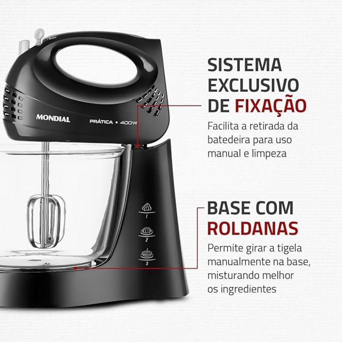 SISTEMA EXCLUSIVO DE FIXAÇÃO: Sistema desenvolvido pela Mondial para facilitar a montagem da batedeira e sua limpeza.