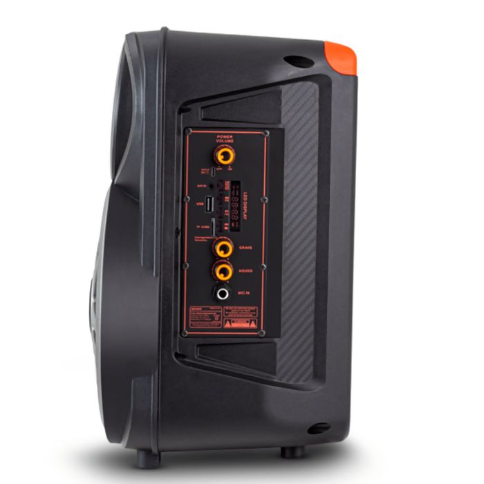 Conta ainda com alto falantes com led e alça para facilitar o transporte.