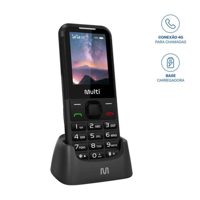 Celular Vita 4G com Base O Celular Vita 4G combina design moderno e qualidade de som excepcional durante as chamadas, com volume aumentado para toques e notificações. Este aparelho inclui uma base carregadora para maior praticidade no carregamento. Ele também vem com uma lanterna e um botão de emergência que envia mensagens e realiza chamadas emergenciais para contatos pré-cadastrados. As teclas grandes são fáceis de apertar, proporcionando maior acessibilidade. Com design slim, o Vita 4G é leve e compacto, ideal para evitar danos por esforço repetitivo. *Imagens meramente ilustrativas.