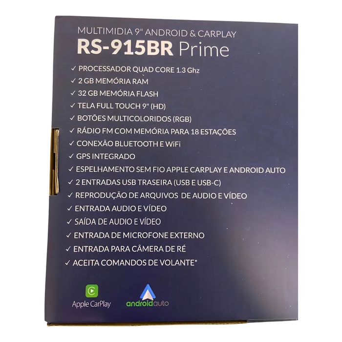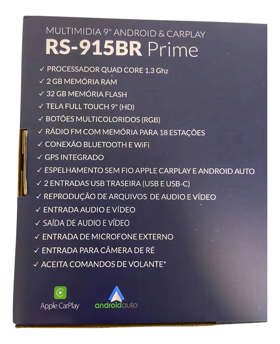 Fotos do produtoVer mais imagens DescriçãoMultimídia Roadstar Rs-915br Prime Android e Car Play 9 polegadas Informações Técnicas: Sistema: Android Processador: Quad Core 1.3 Ghz Memória RAM: 2 Gb Memória FLASH: 32 Gb Painel: Fixo com botões touch e iluminação RGB Tela: Vidro Full Touch IPS 9" Capacitiva Rádio: FM com memória para 18 estações FM Conexões: Bluetooth, WiFi e GPS (Acompanha Antena) Entradas traseiras: 2 Vídeo Auxiliar, 2 RCA (Audio), 1 Câmera de Ré, 2 USB´s (USB e USB-C) e Microfone Externo (Acompanha Microfone) Saídas: 2 RCA (Audio) e 2 RCA (Vídeo) Comando de Volante: SIM (em alguns modelos de carros poderá ser necessário o uso de interface) Potência: 4 Canais de 50 Watts RMS Tela de Vidro 9" Full Touch com IPS A multimídia RS-915BR Prime possui botões com iluminação em RGB e tela de Vidro 9" full touch IPS com uma interface intuitiva e amigável. Conectividade Através da conexão Bluetooth você pode atender, ou efetuar, suas chamadas telefônicas e também reproduzir suas playlists de seu celular direto na RS-915BR Plus, você também poderá instalar seus programas Android preferidos direto na RS-815BR Plus. Espelhamento Você pode espelhar seu celular com sistema Android ou IOS* diretamente na tela da RS-915BR Plus através do WiFi (Sem fio), ou através do Bluetooth utilizando toda a comodidade do Apple CarPlay ou do Android Auto. *Espelha Android a partir da versão 5 e Iphone. GPS A RS-915BR Prime possui GPS integrado com navegação On-Line (Conectado ao WiFi) e Off-Line (Podendo baixar os mapas direto para multimidia) IMPORTANTE: Recomendamos que a todas instalações sejam realizadas por profissional ou loja especializada. |