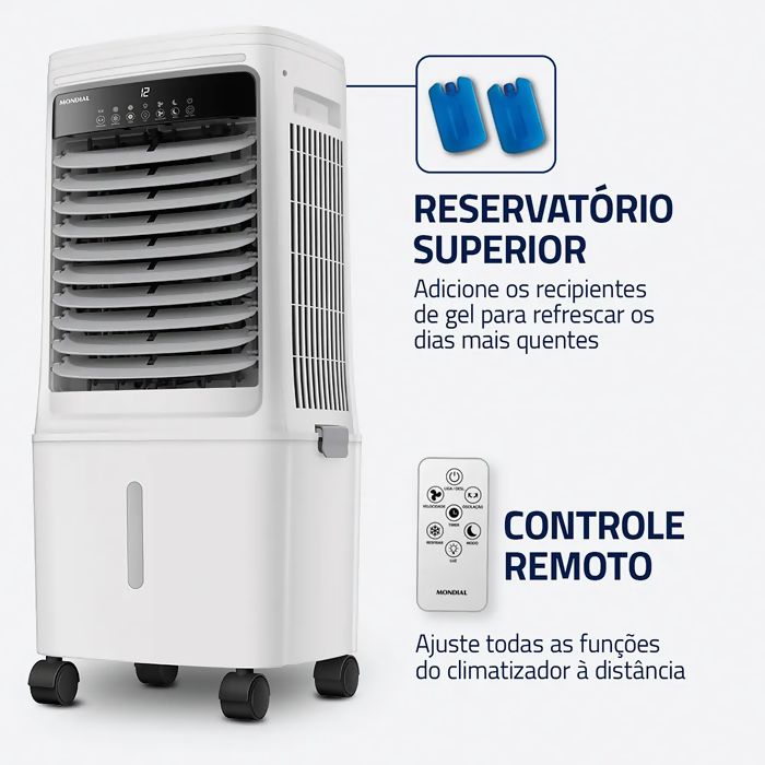 Reservatório Superior: Permite adicionar água e gelo de forma simples e rápida para turbinar a climatização nos dias mais quentes. Acompanha 2 recipientes com gel para um resfriamento ainda mais eficiente.