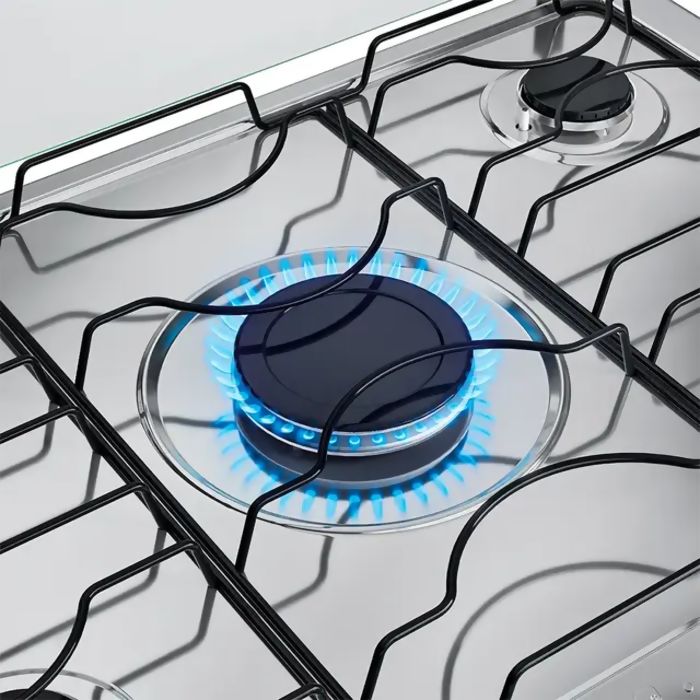 A versão 5 bocas conta com 2 queimadores semirrápidos de 1,67kW, 2 queimadores rápidos de 2,0kW, 1 queimador Mega Chama de 3,0kW e forno com capacidade de 86,5 litros.
