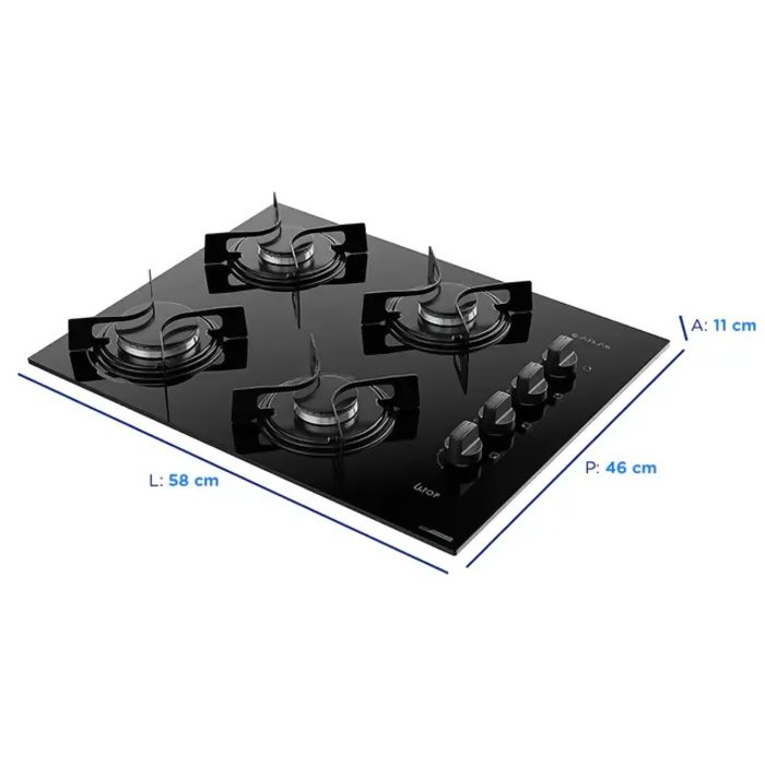 A versão 4 bocas possui 3 queimadores de 1,65 kW, 1 queimador Mega Chama de 2,85 kW e medidas 58 x 11 x 46 cm (largura x altura x profundidade).