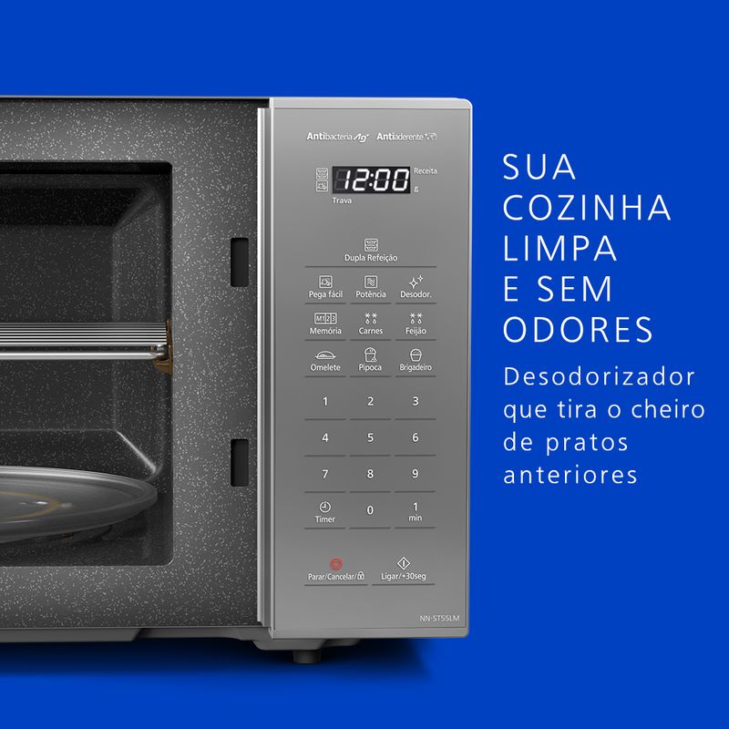 ¹Testado em laboratório independente creditado considerando os micro-ondas já fabricados pela Panasonic, com revestimento comum. Teste realizado com sujidade de leite e ovo.²Teste realizado com Staphylococcus aureus e Escherichia coli. Testado em laboratório independente creditado.³Funciona com preparações de até 5 minutos.