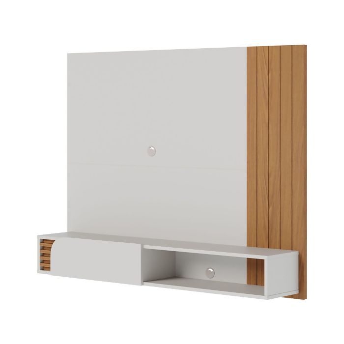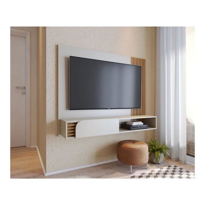 O painel suspenso para TV Jurerê da Colibri é a síntese perfeita entre o retrô e o contemporâneo que elevam o estilo do seu espaço. Apliques ripados com 20mm de profundidade criam uma envolvente sensação de volumetria, especialmente acentuada pela porta com canto curvo. Ele foi projetado com 1 nicho espaçoso, ideal para acomodar aparelhos e decorações, proporcionando funcionalidade sem renunciar ao design refinado. O painel amadeirado apresenta frisos com acabamento em pintura PU, conferindo um toque sofisticado. Compatível com TVs de até 55", une elegância e praticidade, tornando-se o centro das atenções na sua sala.