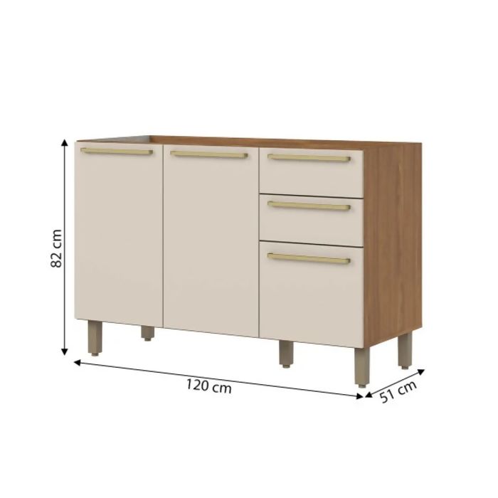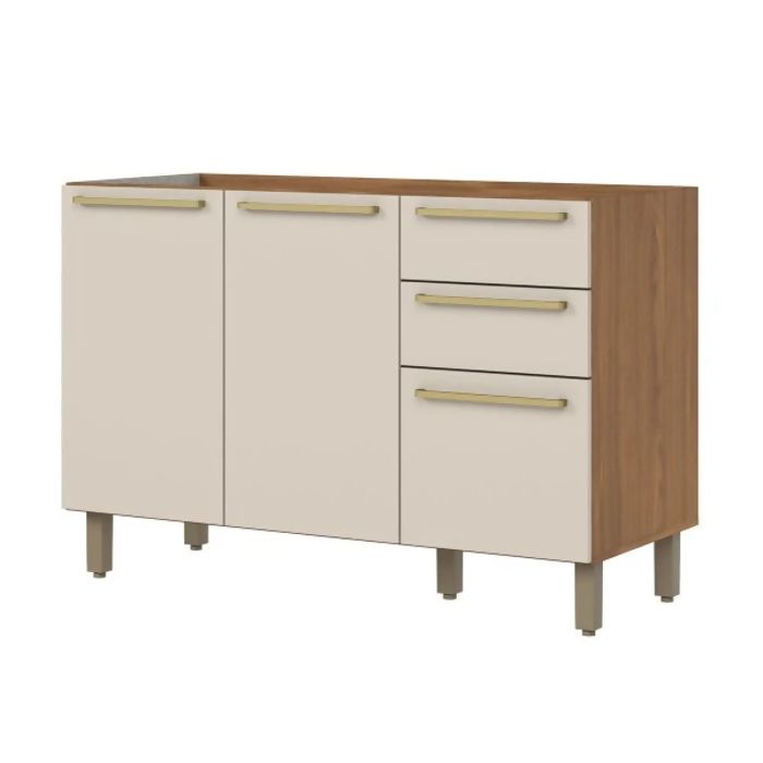 São 3 portas, 2 gavetas e 1 prateleiras com muito espaço interno para você aproveitar! Sejam artigos de louça, panelas, utensílios não importa! Você escolhe o que guardar e pode usar novamente com facilidade. Por ele ser sem tampo você pode escolher qual é o melhor modelo de pia ou até mesmo utilizar com tampo da sua preferencia.