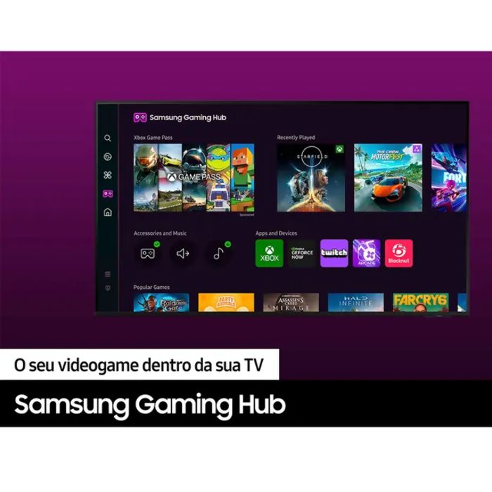 Cores estonteantes, detalhes cristalinos, sons imersivos, movimentos rápidos, jogos velozes....Experiência única e envolvente como você merece! O som segue o movimento, os conteúdos podem ser vistos do smartphone direto na telona, as disputas gamers ficam mais intensas e divertidas com o modo Motion xcelerator, e o aplicativo Samsung TV Plus disponibiliza mais de 80 canais de variedades para você curtir na faixa!